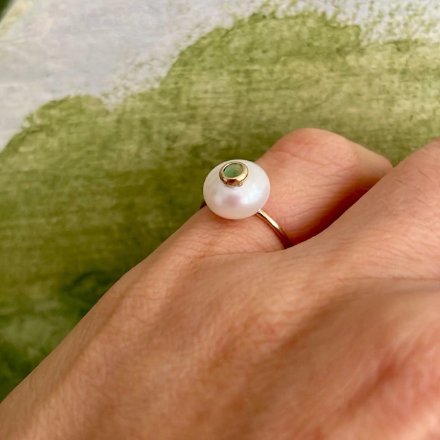 Esse anel em ouro 18k combina a suavidade da pérola botão com a intensidade da esmeralda em um design minimalista, mas cheio de significado.