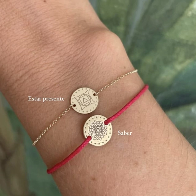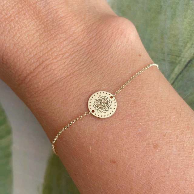 Pulseira Ouro 18k Plaquinha Redonda de 1cm com borda e Chakra - 18cm e argolinha no 16cm.